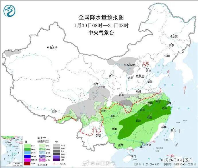 这股冷空气还将带来大范围雨雪天气,29日北方多地有明显降雪过程,29日-31日南方大部有雨雪现身,湖南西部、湖北西部及广西北部等地局地警惕有冻雨出现。